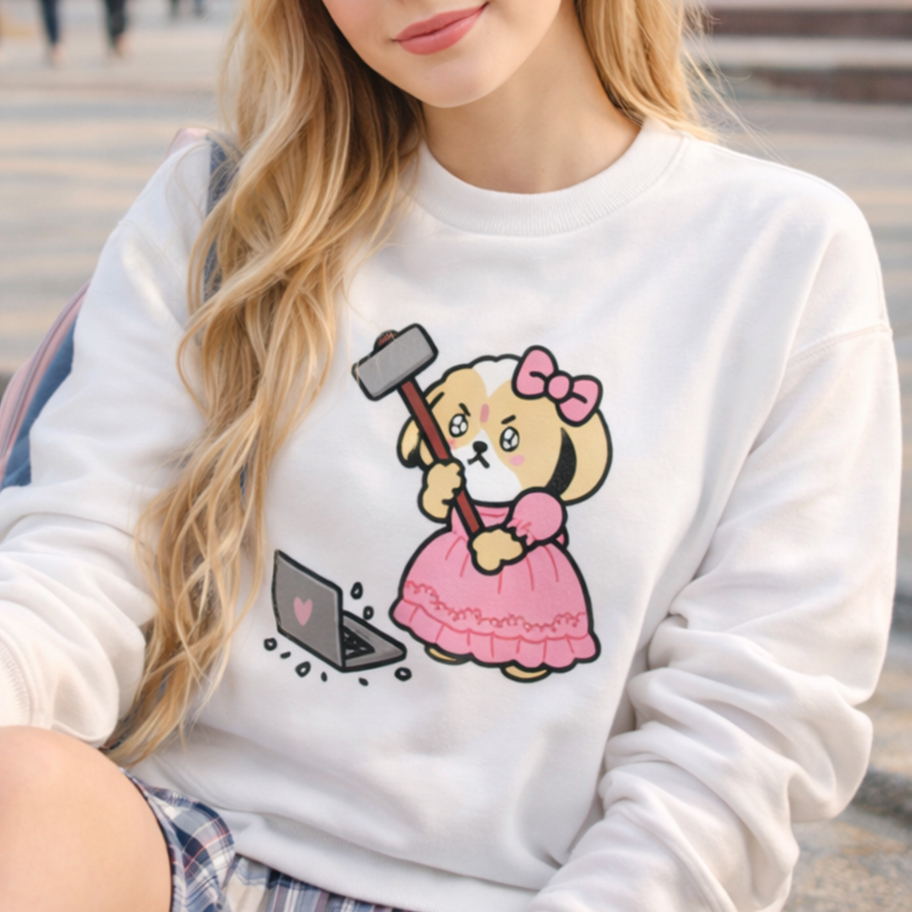 This playful hoodie features a puppy in a pink dress with a hammer — combining cuteness, humor, and bold attitude.