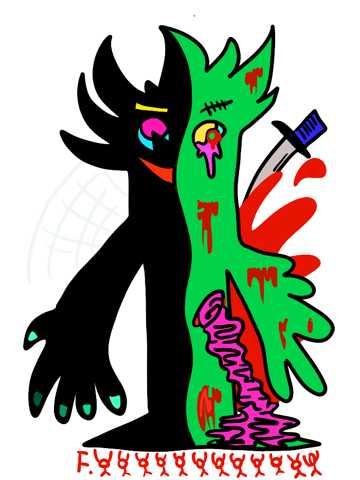 Devil 1/2 은 1000년 전 신과 인간의 전쟁에서 인간의 칼을 맞고 전사한 어느 행성의 신이다. 사실 외계 몬스터와 인간의 전쟁이었는데 자기들은 스스로를 신이라 칭한다. 전사한 날 하늘로 올라가다 다른 영혼들과 뒤엉켜 지상으로 추락하게 됐는데 그 때 모든 전쟁이 끝나고 천상의 문이 닫히자 Devil 1/2이란 이름으로 지상에 갇히게 되었다. 1000년간 숨어 살다가 지구가 멸망하자 스물스물 기어나와 현재는 몬스터 다락방에서 자칭 신을 맡고 있다. 그래서 놀기만 한다. 발 아래에 있는 건 불개미 몬스터인데 불개미들만이 Devil 1/2를 진짜 신이라 생각하며 들어 나른다.
