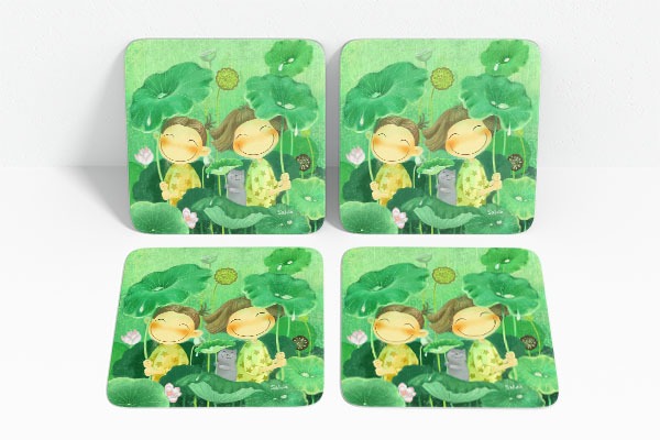 It is made of the specially-coated printed area and cork. It is resistant to color fading because it is water-proof and features great color expressions. It is made as a set of two identical coasters.