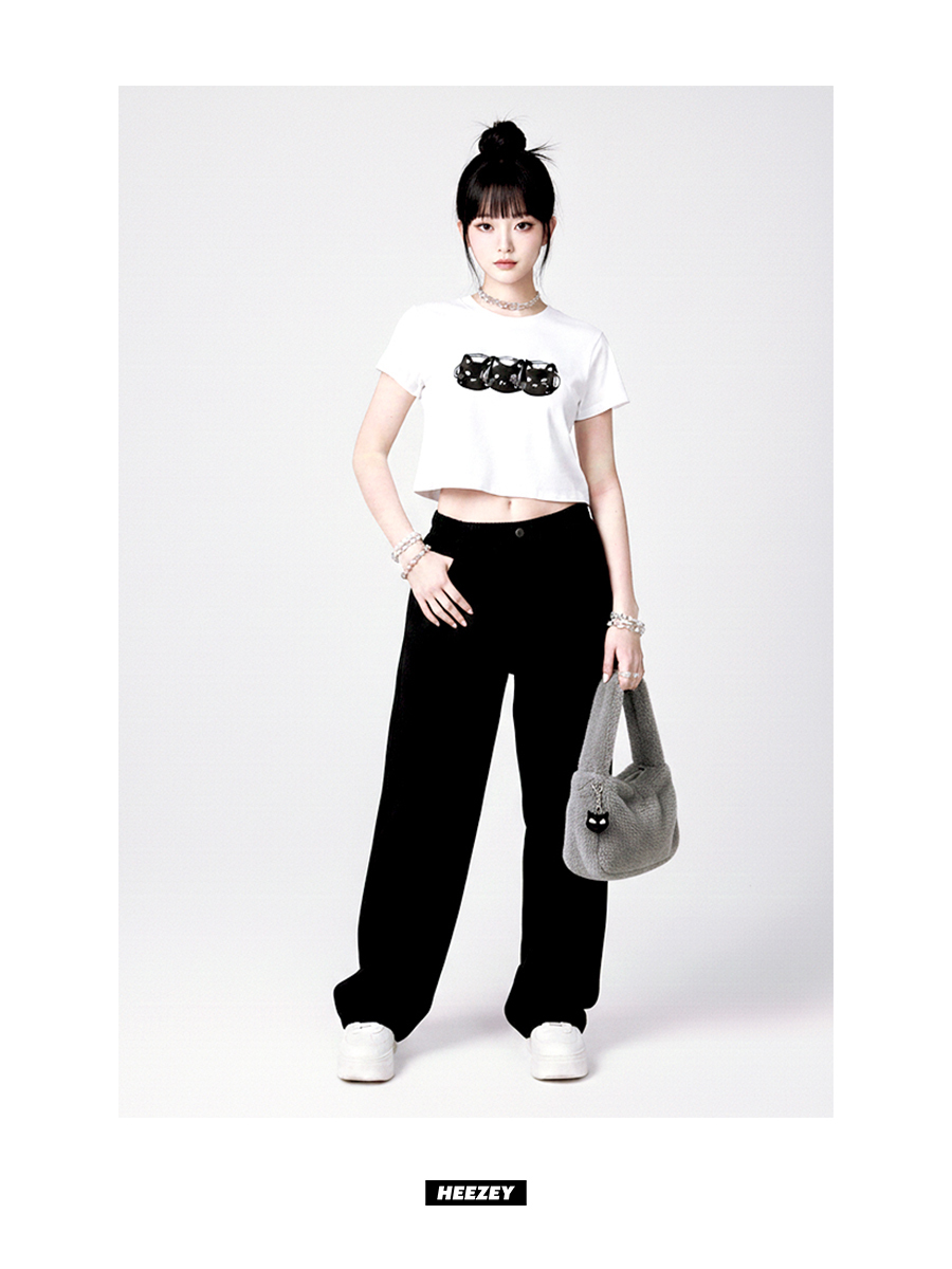 This product is a comfortable semi-crop t-shirt with a non-restrictive length, designed for a relaxed fit.