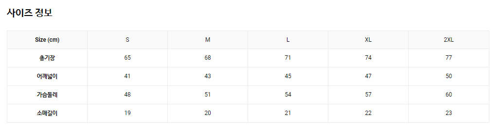 | Size (inch) | S | M | L | XL | 2XL |