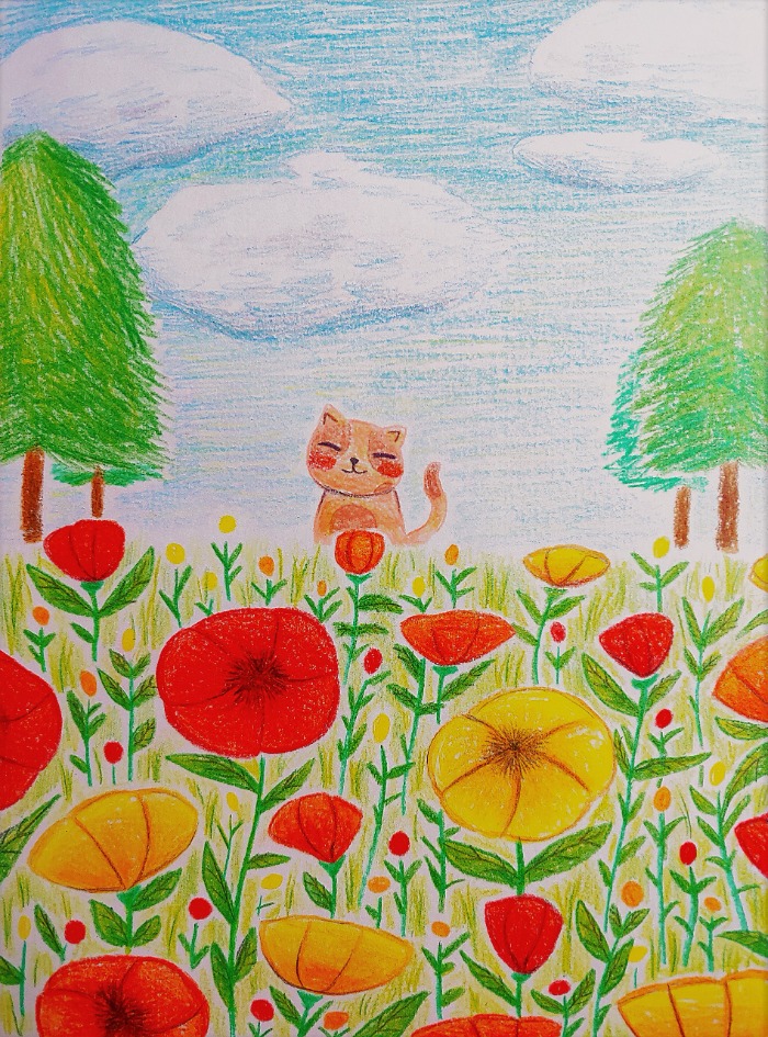 양귀비 고양이 색연필그림