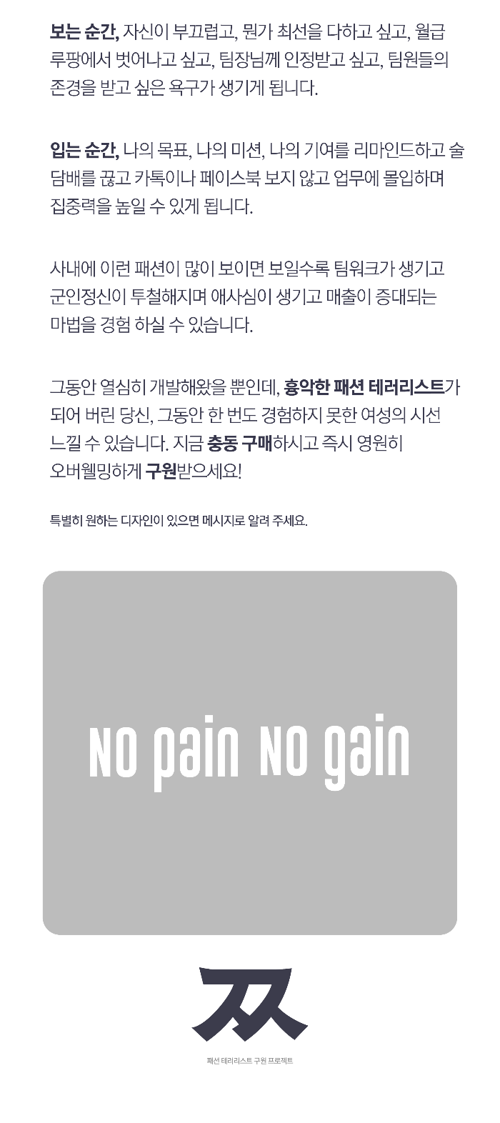 그동안 열심히 개발해왔을 뿐인데, 흉악한 패션 테러리스트가 되어 버린 당신, 그동안 한 번도 경험하지 못한 여성의 시선 느낄 수 있습니다. 지금 충동 구매하시고 즉시 영원히 오버웰밍하게 구원받으세요!