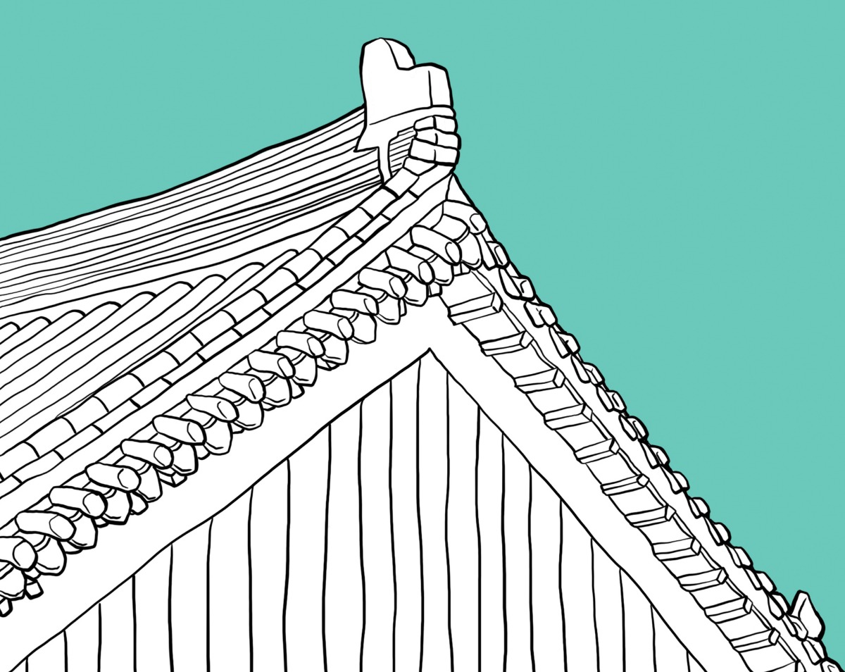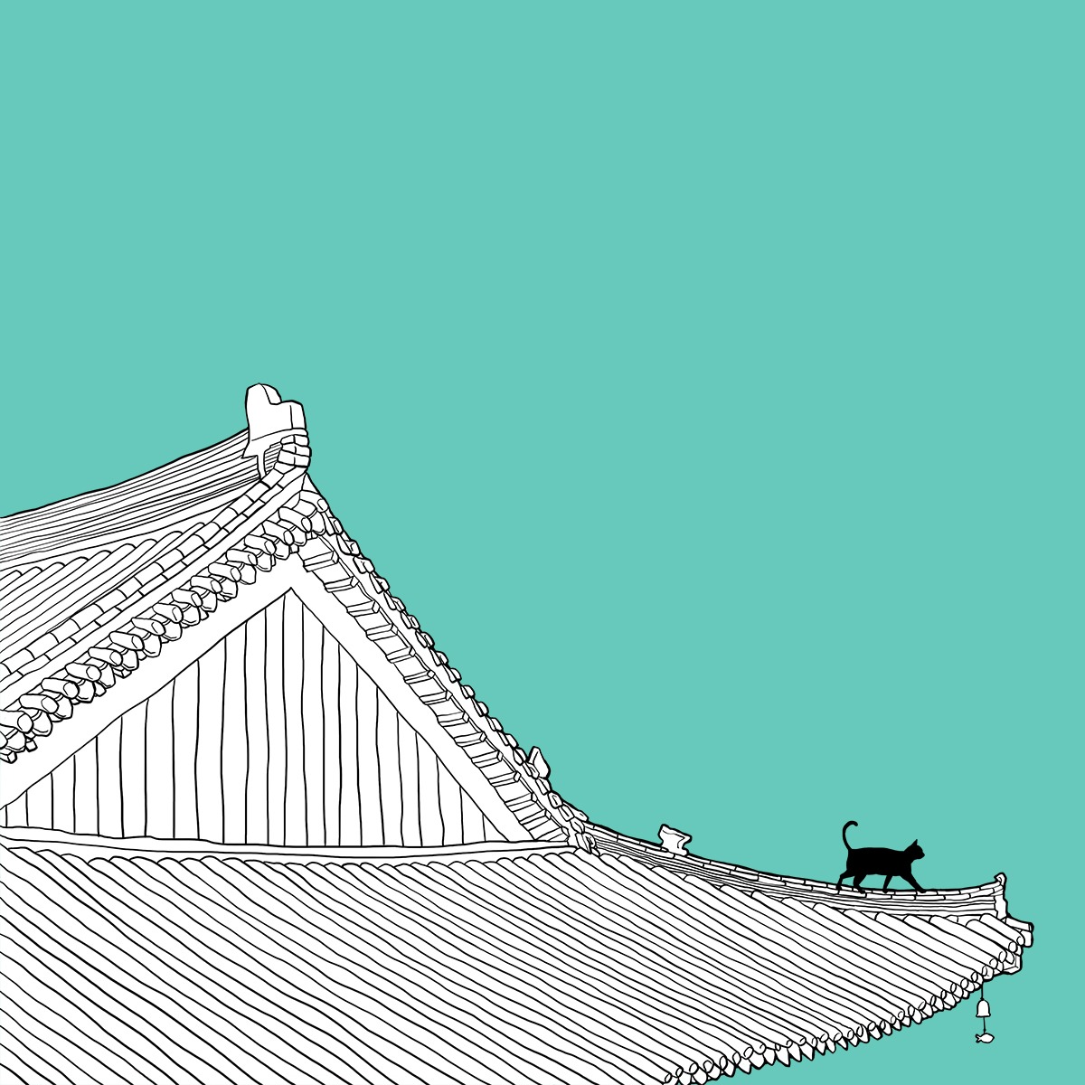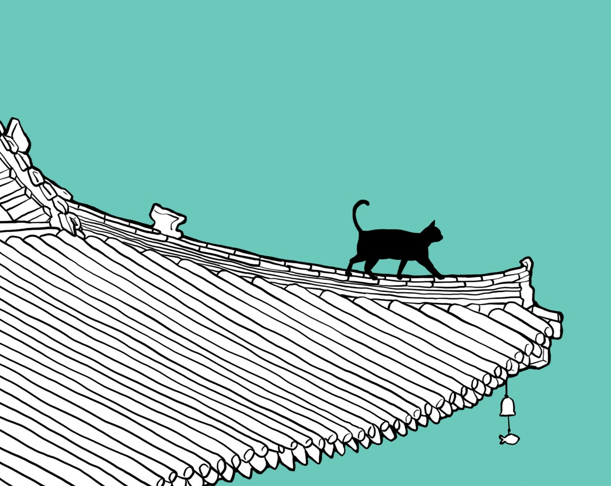 궁 지붕위를 걷는 검은 고양이입니다.