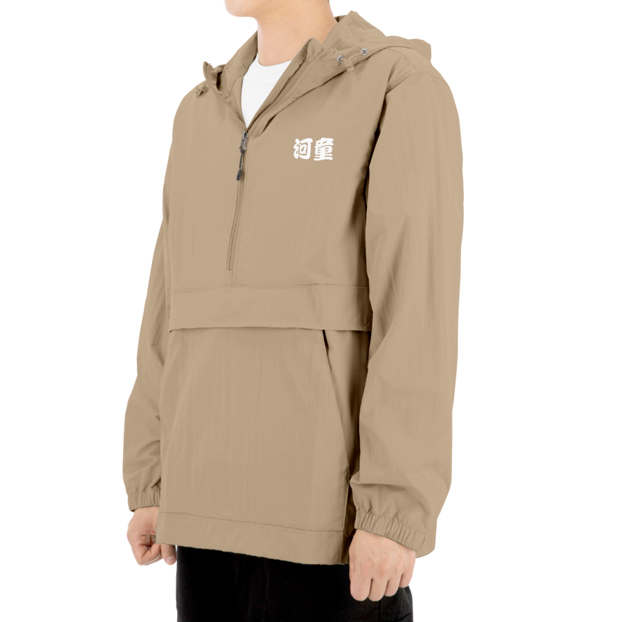 It is a lightweight anorak windbreaker made of nylon.