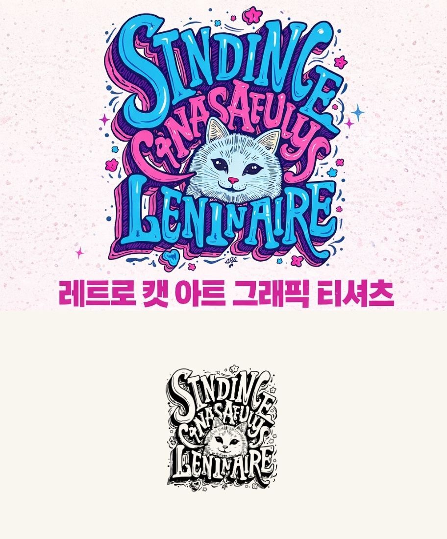 레트로 감성의 타이포그래피와 사랑스러운 고양이 일러스트가 조화를 이루는 그래픽 티셔츠입니다.