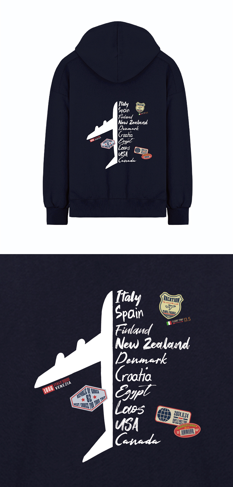 従来のフードTシャツとは異なり、カンガルーポケットではなく、ウエストラインのポケットで様々なプリントが可能です。