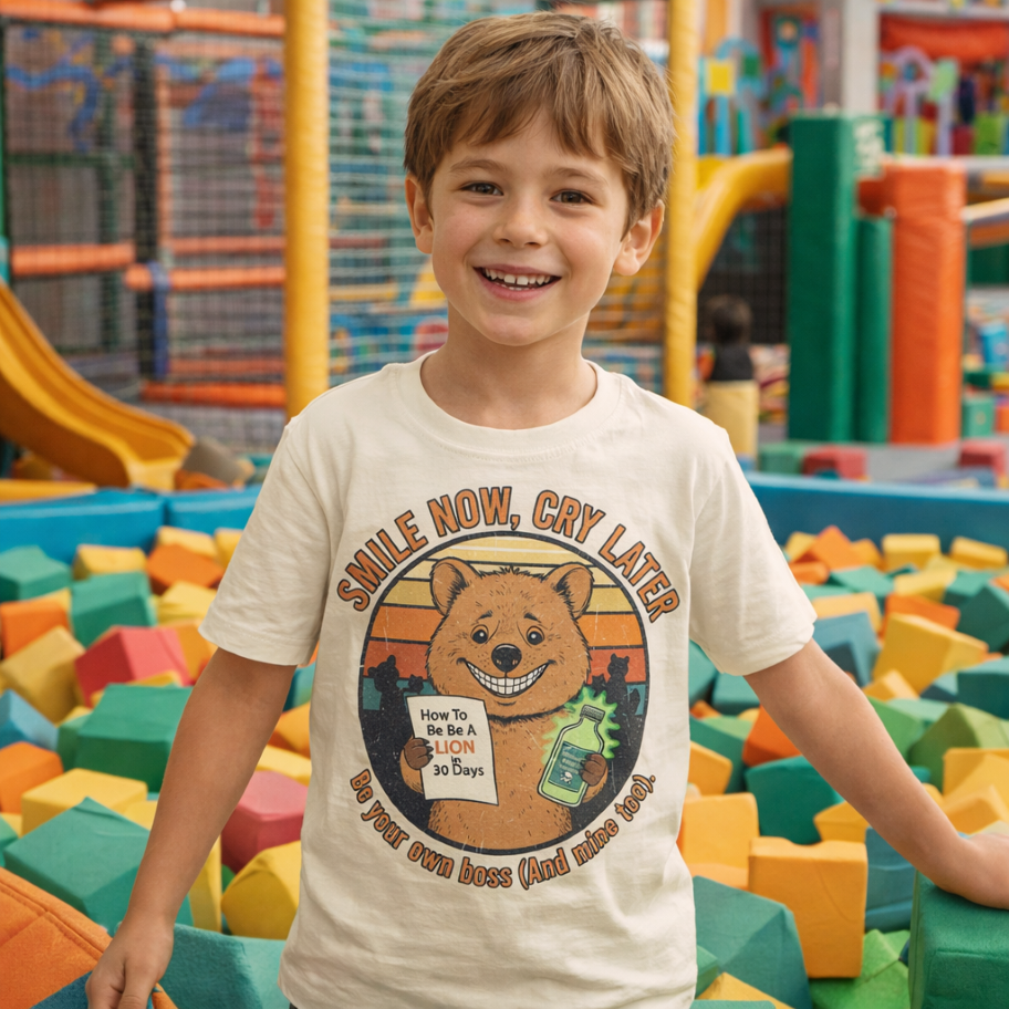 세상에서 가장 행복한 동물 쿼카와 함께 우리 아이의 미소를 지켜주세요! 디자이너 fake joo의 감성이 담긴 키즈 그래픽 티셔츠입니다.