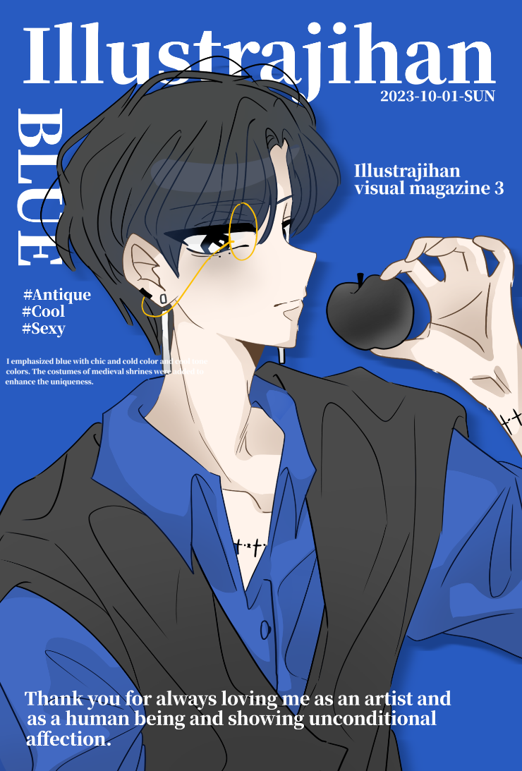 시크하고 차가운 한색과 쿨톤 느낌의 채색을 하여 파란색을 강조하였습니다. 중세시대 신사의 복장을 더하여 유니크함을 더욱 돋보이게 했습니다.