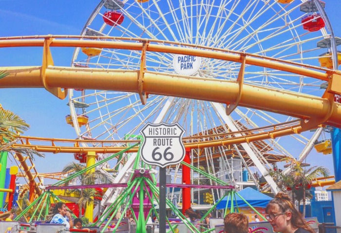 다양한 색상을 가진 산타모니카의 해변, 그 곳에 있는 66번 국도와 작은 놀이동산,