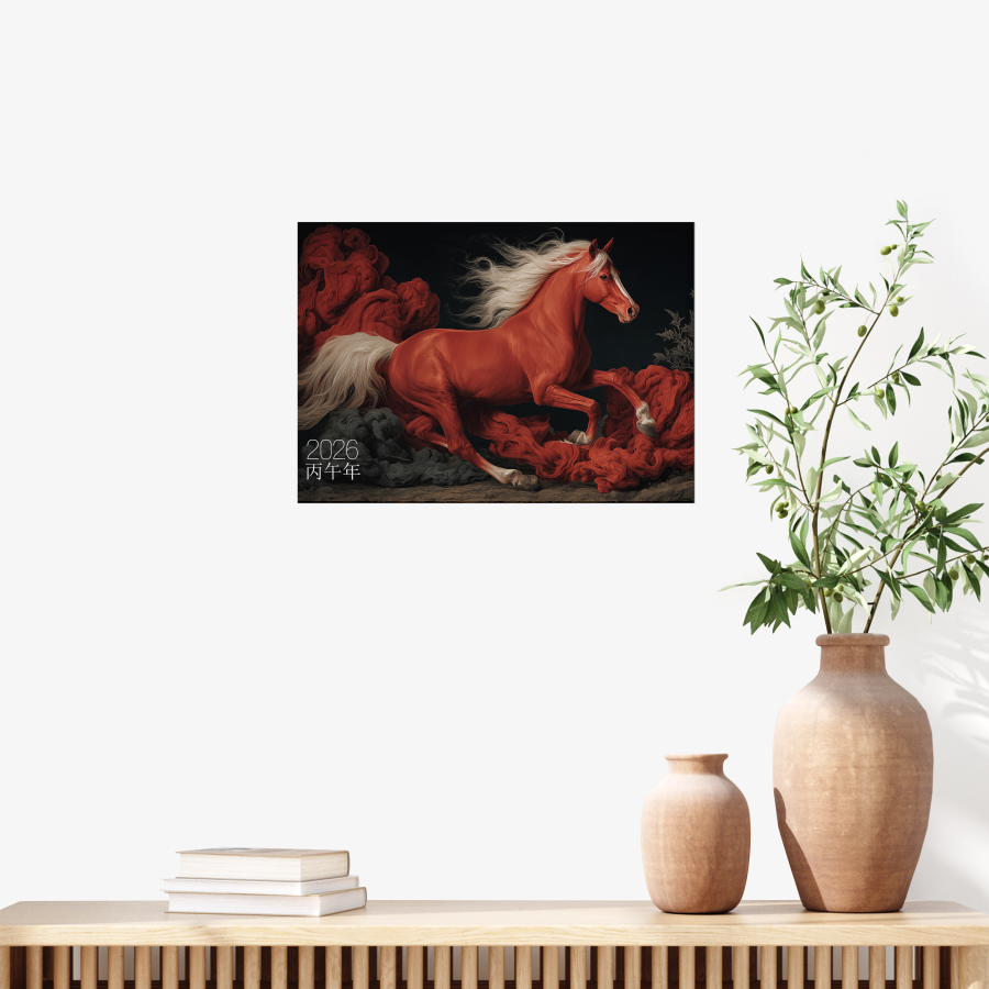 2026년은 강력한 불(火)의 기운을 상징하는 **‘붉은 말의 해(병오년)’**입니다. 이번 모던 에디션은 승리와 성공을 상징하는 전설 속 명마 **‘적토마(赤兎馬)’**의 압도적인 아우라를 세련된 다크 무드와 타오르는 듯한 색채 대비로 재해석한 프리미엄 아트 포스터입니다.