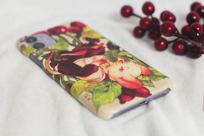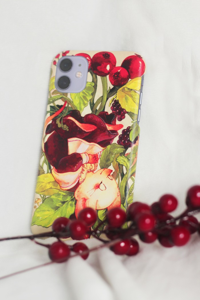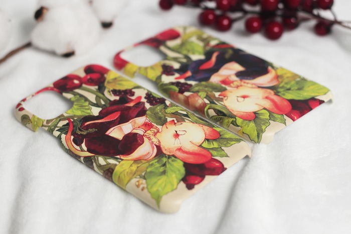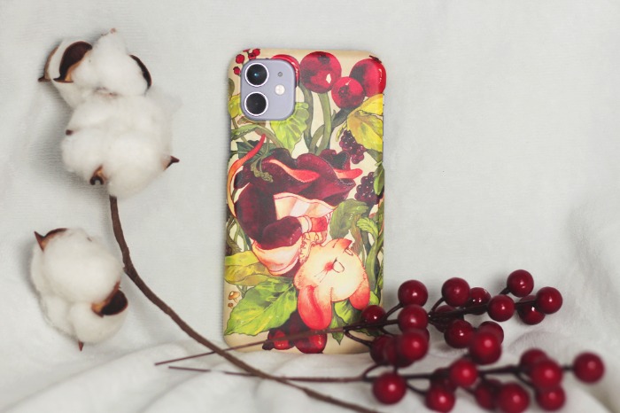 사랑스러운 하얀 쥐 데이지가 열매와 풀잎들 위에서 편히 잠든 모습을 핸드폰 케이스에 담았습니다.
