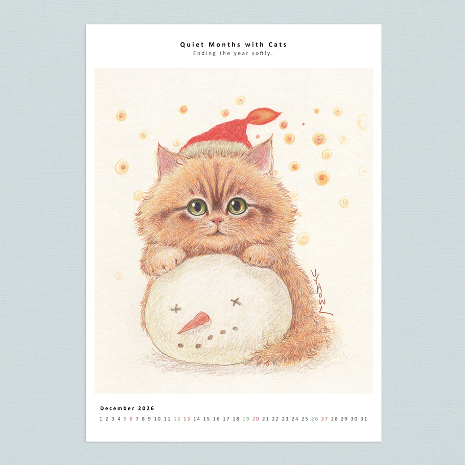 今月のイラストは、雪だるまを温めようとする子猫を描き、柔らかく遊び心のある冬の物語を表現しています。1年の締めくくりに、温かくほっこりした雰囲気をお届けする作品です。