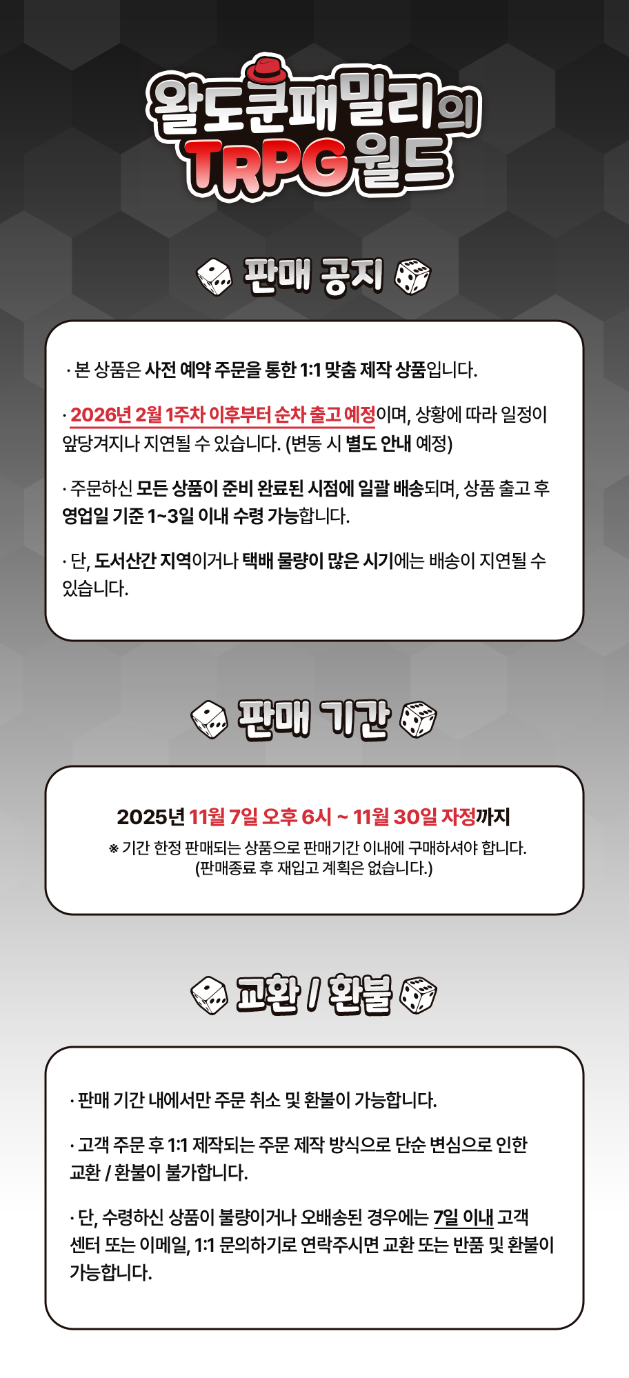 - 맞춤 제작·신선식품 등은 환불·교환이 불가합니다.