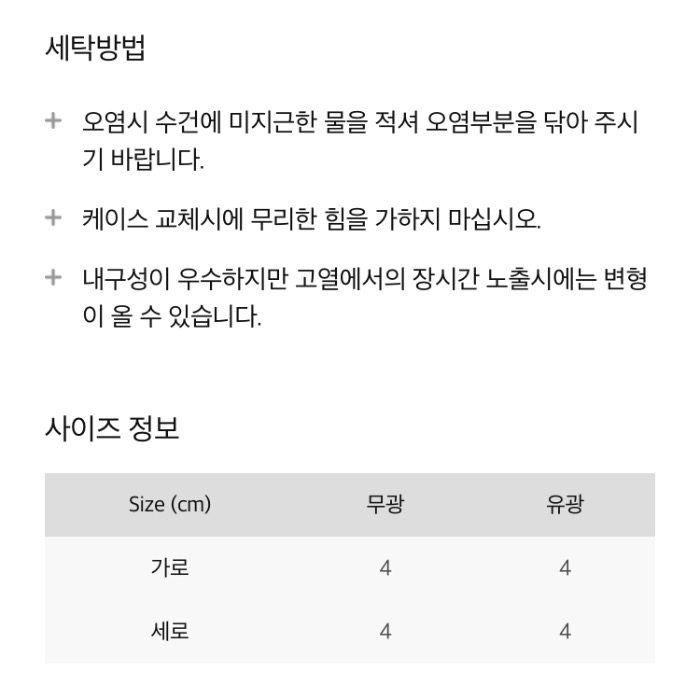 | Size (cm) | 무광 | 유광 |