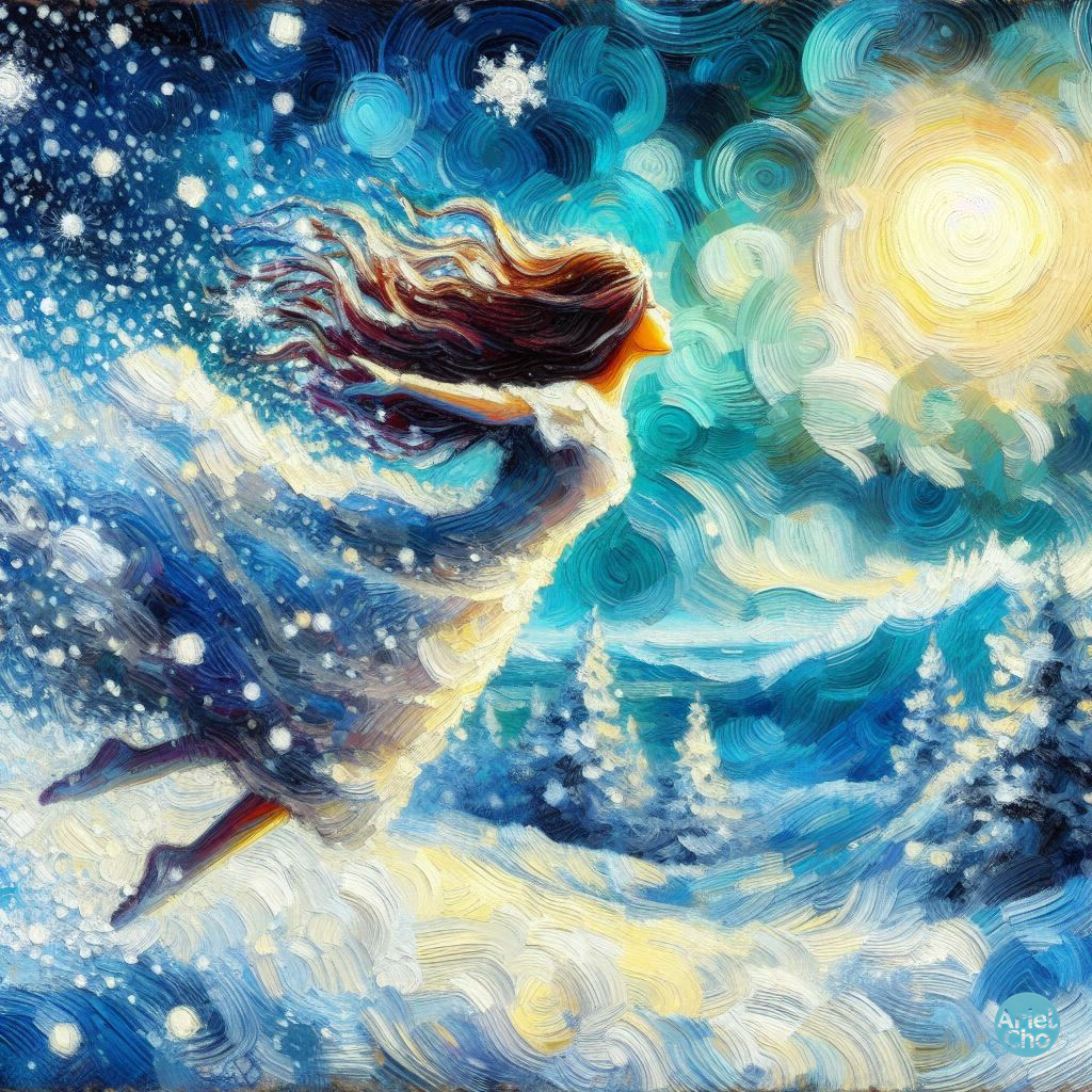 하얗게 눈 쌓인 숲 위를 자유롭게 나는 소녀를 형상화 했습니다~