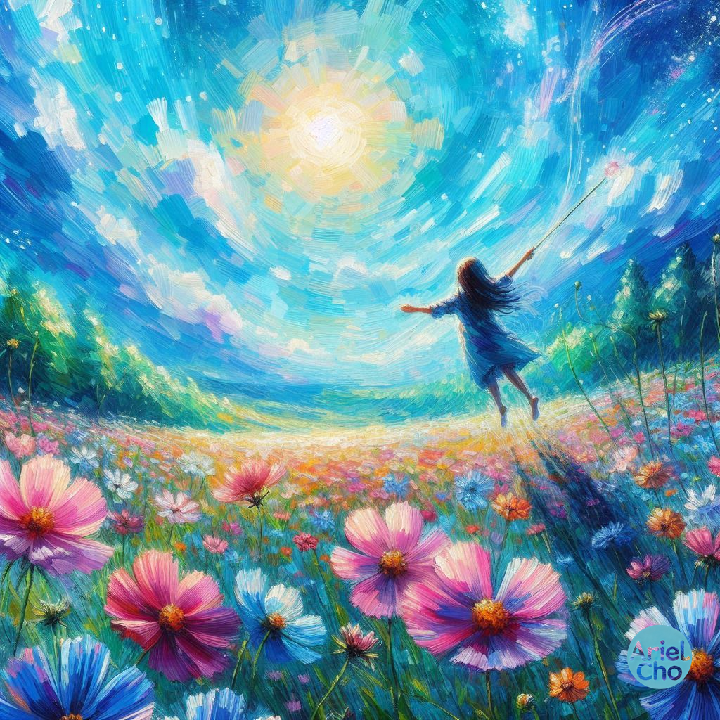 끝없이 피어있는 코스모스 위를 자유롭게 날면서 두 팔 벌려 태양을 바라보는 소녀입니다.