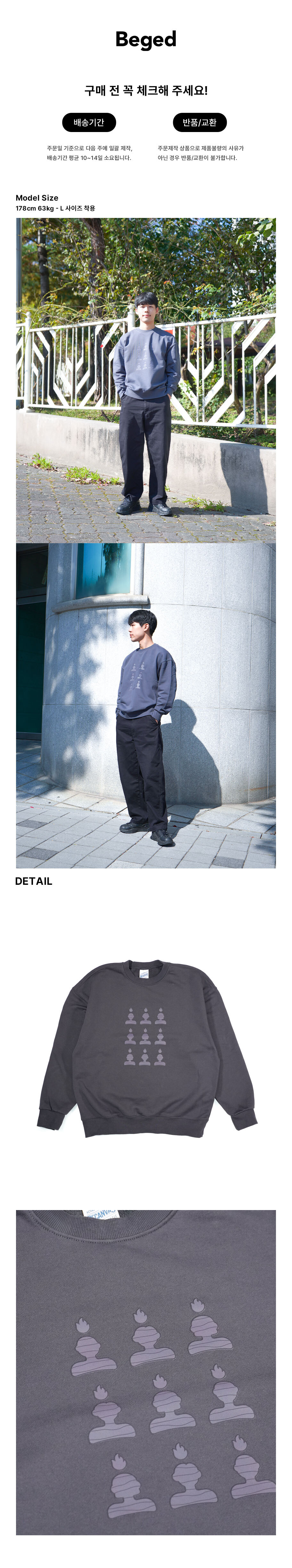 또한, 세탁 시 수축을 방지하기 위해 덴타 가공 처리가 되어 있는 맨투맨입니다.