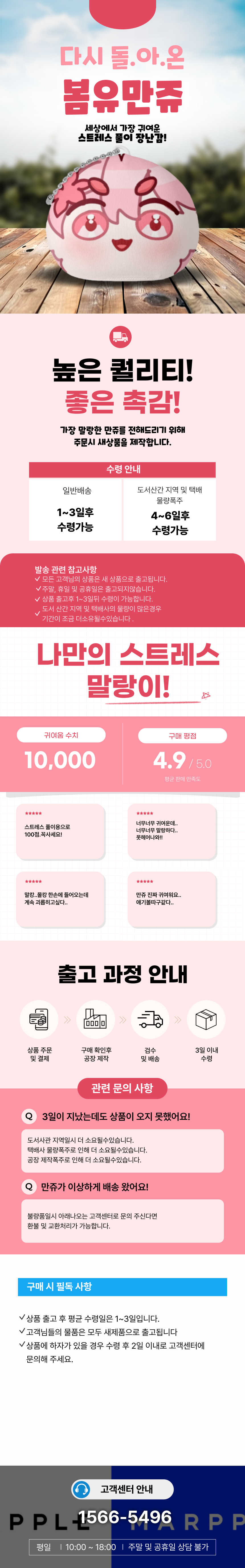 상품 출고 후 영업일 기준 1~3일 이내 수령이 가능하며 도서 산간 지역이거나 택배사의 물량이 많은 경우 기간이 조금 더 소요될 수 있습니다. |