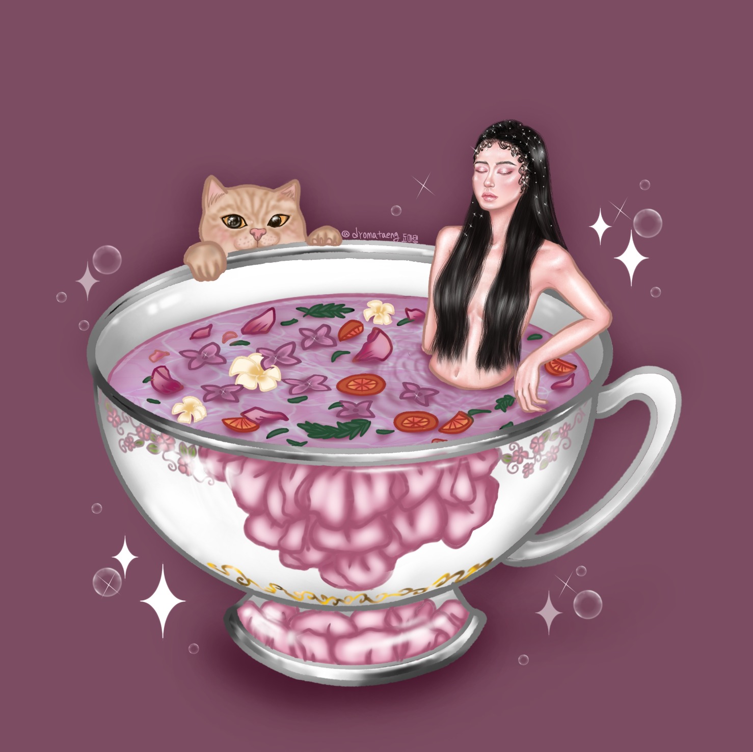 꽃차에 목욕을 하는 여인과 함께하길 바라는지 고양이의 눈이 반짝여요