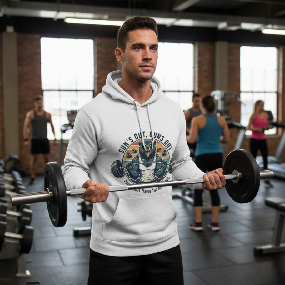 이번 로고는 "해가 뜨면 팔 근육을 보여줄 시간(Sun's Out, Guns Out)"이라는 헬스 매니아들의 슬로건과 함께, 바벨을 들고 포효하는 근육질 곰의 모습을 레트로한 그래픽으로 담아냈습니다. 빈티지한 오렌지·그린 톤의 배경이 강인한 인상을 주어, 헬스장에서 운동할 때뿐만 아니라 스포티한 데일리 룩으로도 손색이 없습니다.