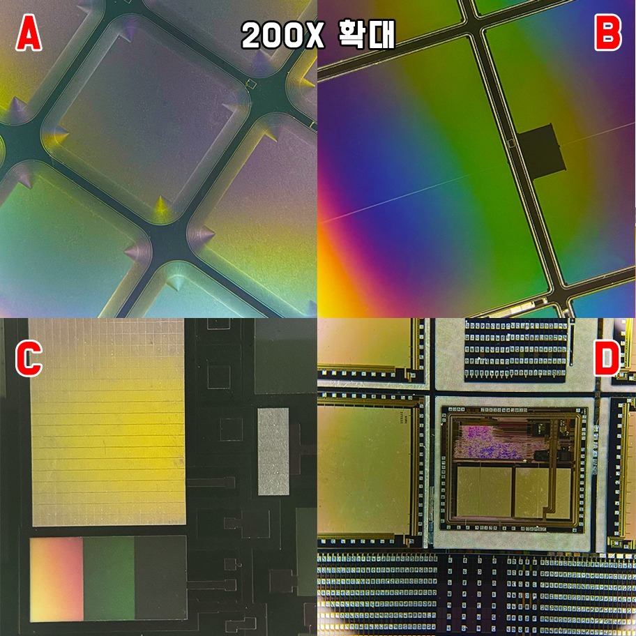 웨이퍼 표면의 매우 얇은 층들이 빛의 간섭현상을 일으켜 다양한 색상이 나타납니다