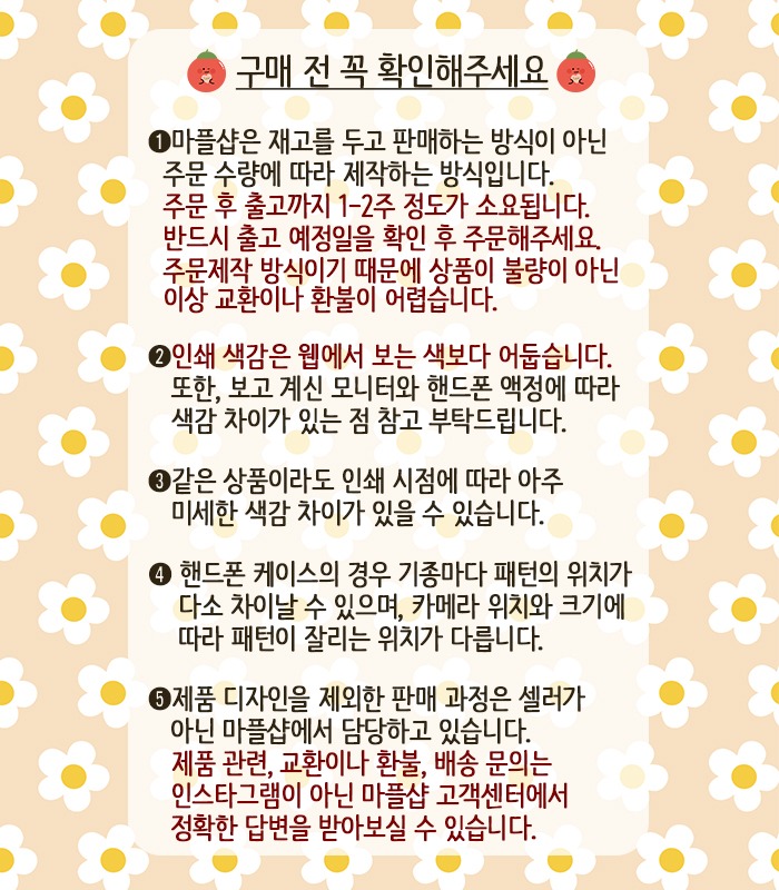 모든 마플샵제작배송 상품은 주문 제작 방식으로 제작되어 단순 변심으로 인한 교환/환불이 불가합니다.