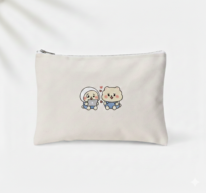 노트북 앞에 나란히 앉아 시간을 보내는 귀여운 곰돌이와 친구의 모습을 담았습니다. 보고만 있어도 기분이 좋아지는 따뜻한 일러스트를 이제 매일 사용하는 파우치로 만나보세요!