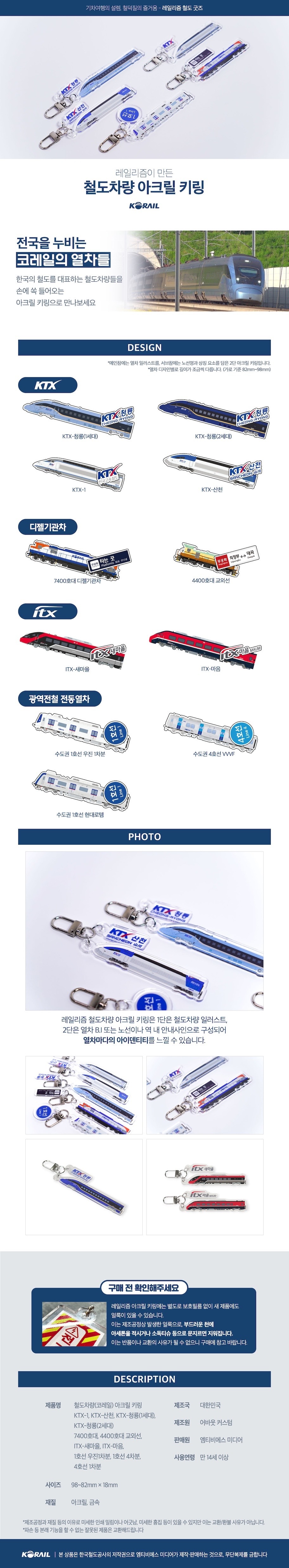 • 제품명 : 레일리즘 아크릴 키링_KTX-1 / KTX-산천 / KTX-청룡 / 수도권 1호선 우진1차분 / 수도권 4호선 VVVF / 7400호대 / 4400호대 교외선