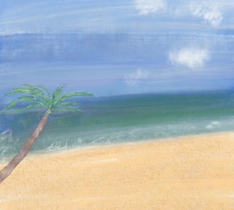부드러운 파스텔 톤으로 그려진 해변 풍경입니다. 왼쪽의 야자수가 운치를 더하며, 맑은 하늘 아래 펼쳐진 에메랄드빛 바다와 따뜻한 모래사장이 평화로운 휴식의 분위기를 자아냅니다.