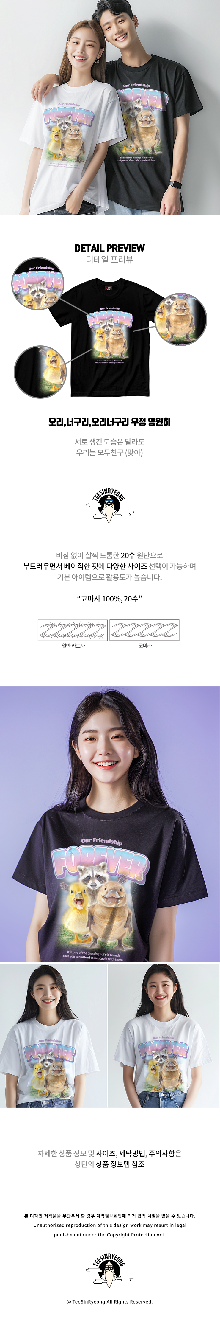 비침 없이 살짝 도톰한 20수 원단으로 부드러우면서 베이직한 핏에 다양한 사이즈 선택이 가능하며 기본 아이템으로 활용도가 높습니다.