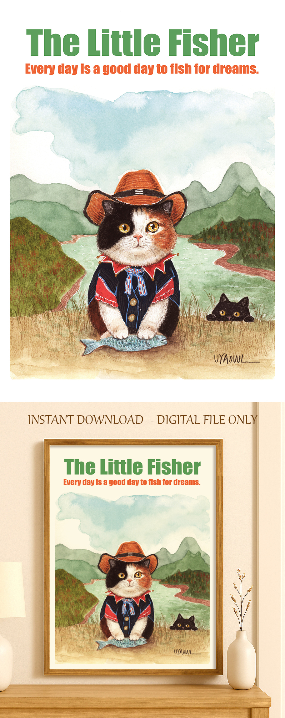 강가에 앉아 조용히 낚시를 하는 작은 고양이의 모습을 담은 일러스트 포스터입니다.