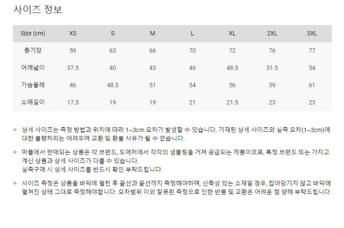 | 어깨너비 | 37.5 | 40 | 43 | 46 | 48.5 | 51.5 | 54 |