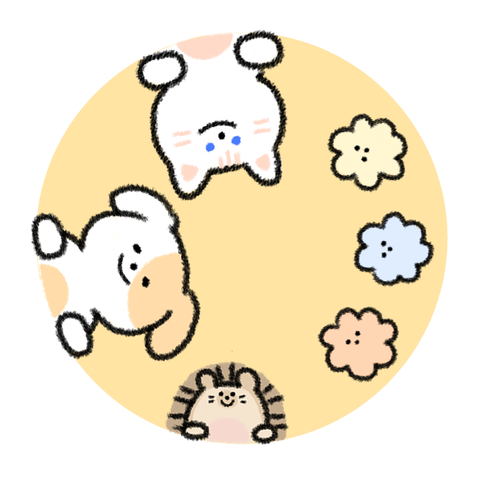 고양이 솜(Som), 강아지 뭉(Moong), 고슴도치 치이(Chie), 그리고 뭉이의 애착 인형 보니(Bonnie)까지!