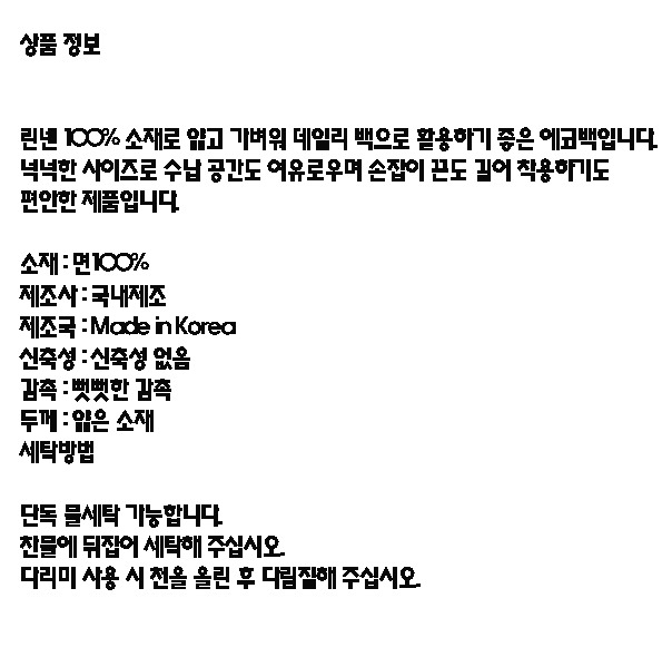 린넨 100% 소재로 얇고 가벼워 데일리 백으로 활용하기 좋은 에코백입니다.
